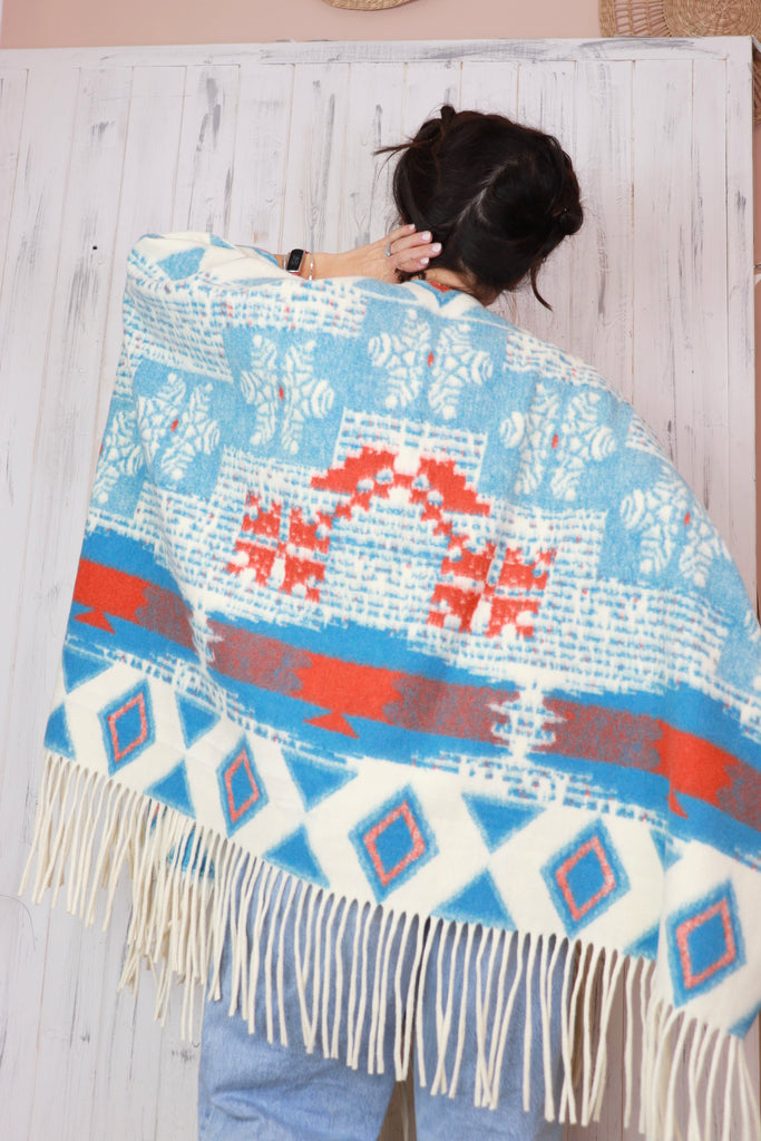 This scarf can be worn as a poncho draped over your shoulders and wrapped around your neck