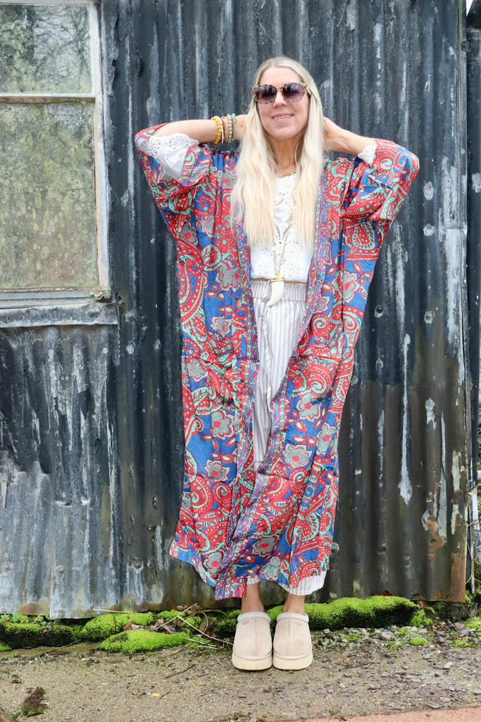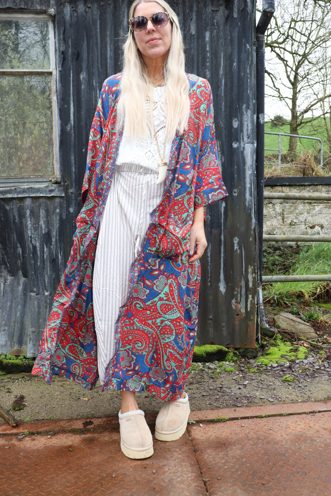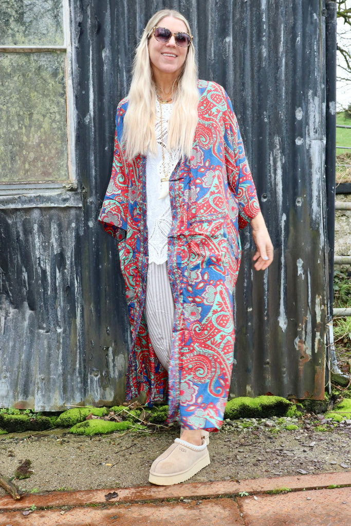 Red and teal long silky floral kimono